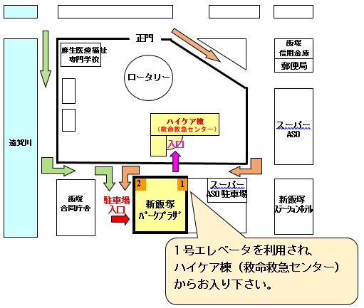 そのような場合は、当院裏側(救急外来方面)の立体駐車場「新飯塚パークプラザ」の利用をご検討ください。
