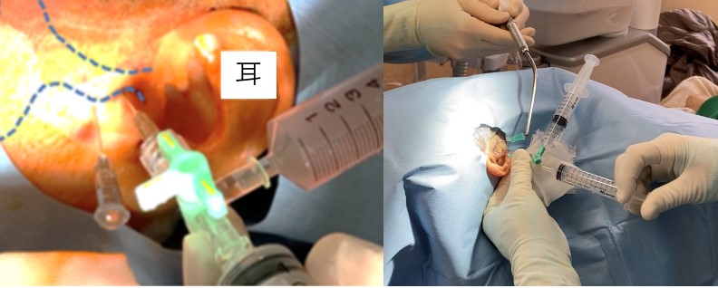 パンピング療法は、上関節腔へ細い針を刺入し局所麻酔薬や生理食塩水のパンピング(注入と吸引を繰り返す)を行い、関節腔内を洗浄します。上関節腔洗浄療法では、上関節腔前方に2本目の細い針を刺入し、生理食塩水などを用いて関節内を洗浄します。これにより、関節内に蓄積した炎症物質や微小な癒着を取り除き、関節の動きを改善するとともに、痛みの軽減が期待できます。